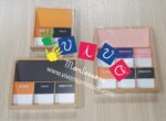 Set da 8 casellari in legno ciascuno con un numero variabile di scomparti per lo studio della grammatica. Sugli scomparti inclinati sono segnalati i nomi delle parti del discorso.