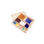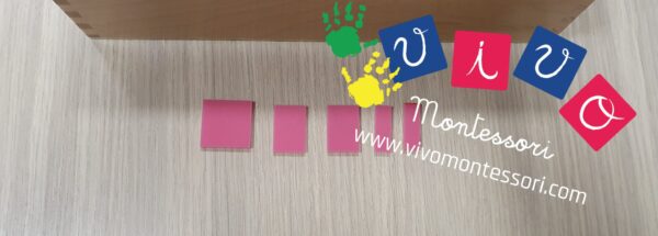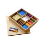 Il materiale consiste in una scatola in legno di faggio a 10 scomparti per riporre i set di quadrati e rettangoli in plastica con codice colore. Con il decanomio sensoriale, il bambino dispone i quadrati e i rettangoli in ordine di grandezza e colore per completare il quadrato del decanomio.