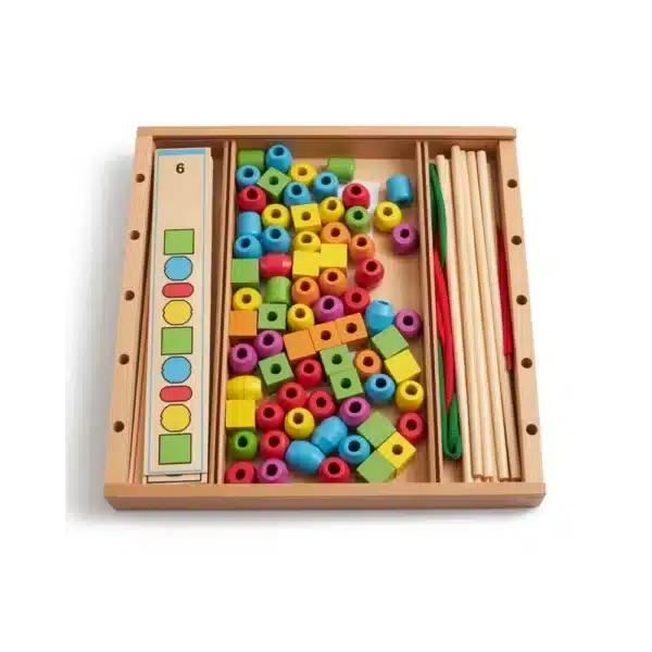 Fantastico gioco di manipolazione che sviluppa la percezione visiva, il riconoscimento di forme e colori e il ragionamento logico. Include tavolette in legno con imamgini per riprodurre sul piolo la fila di dadi di varie forme da infilare.