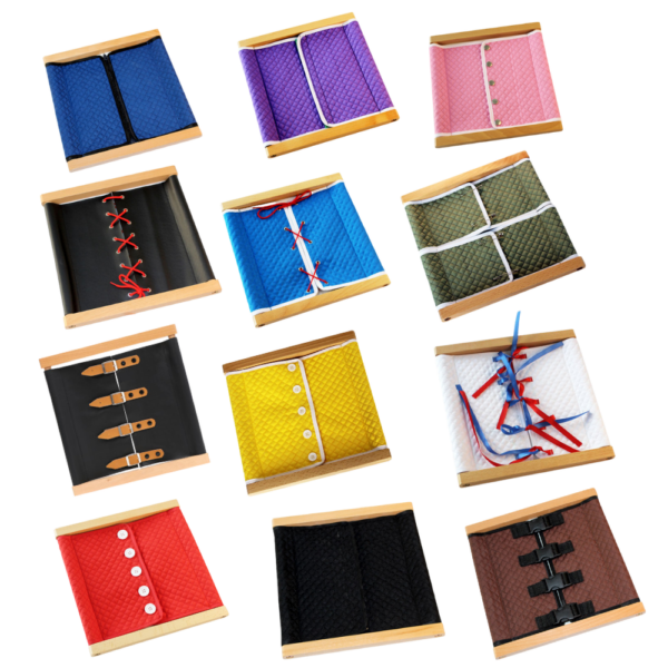 Set composto da 12 telai con allacciature differenti (zip, velcro, bottoni, lacci etc). I telai delle allacciature preparano il bambino all’indipendenza e all’autonomia e favoriscono lo sviluppo della concentrazione. Permettono inoltre lo sviluppo della coordinazione oculo-manuale.