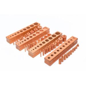 Ogni incastro solido è composto da un supporto di legno, all’interno del quale sono presenti dei fori dove vengono inseriti 5 cilindri di legno che il bambino può facilmente sfilare ed infilare. Ad ogni foro corrisponde un cilindro. I cilindri sono di diversa altezza o grandezza a seconda dell’incastro solido di riferimento.