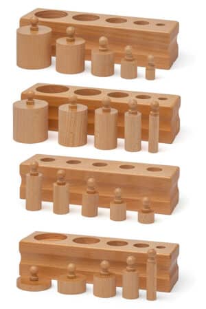 il set è composto dai celebri Blocchi dei Cilindri di Maria Montessori. Si tratta di 4 incastri solidi che permettono al bambino di acquisire i concetti per lui astratti di: “Grosso/Fino”, “Grande/Piccolo”, “Alto/Basso”, “inversamente proporzionale: Basso/Largo e Alto/Fino”.